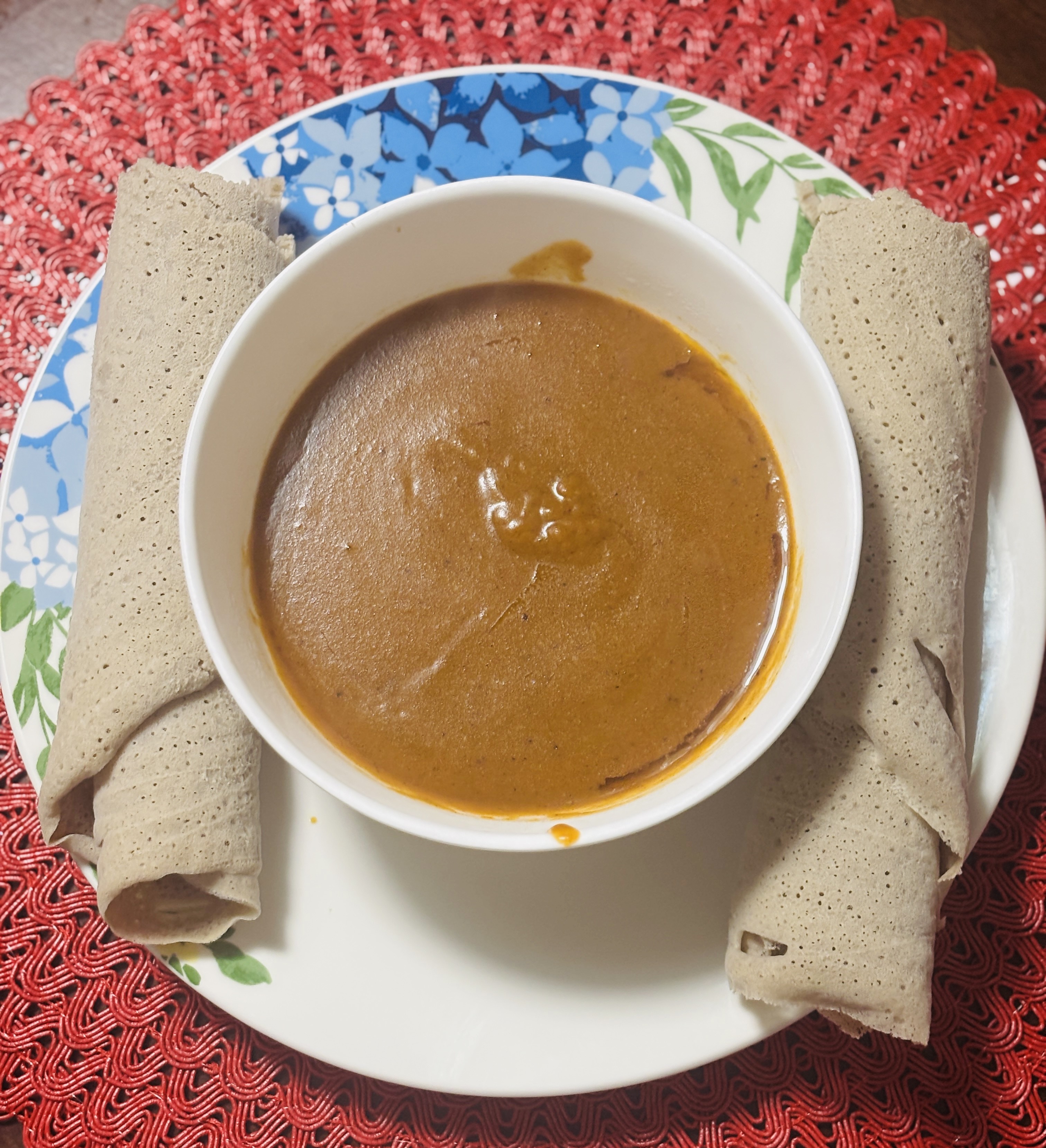 A hearty Ethiopian lentil stew made with red lentils, simmered in a flavorful blend of spices and onions until perfectly tender. Paired with soft, spongy injera, this dish delivers a rich, comforting flavor and a perfect balance of textures.